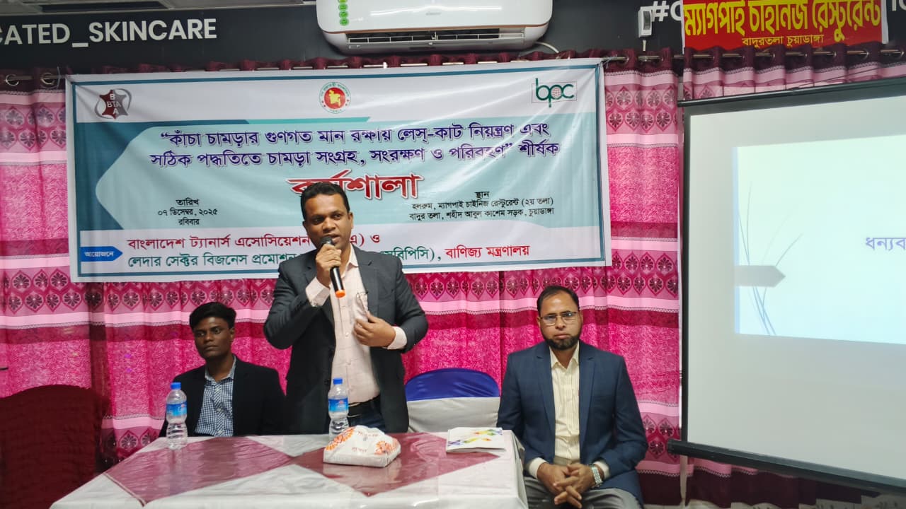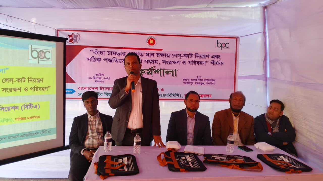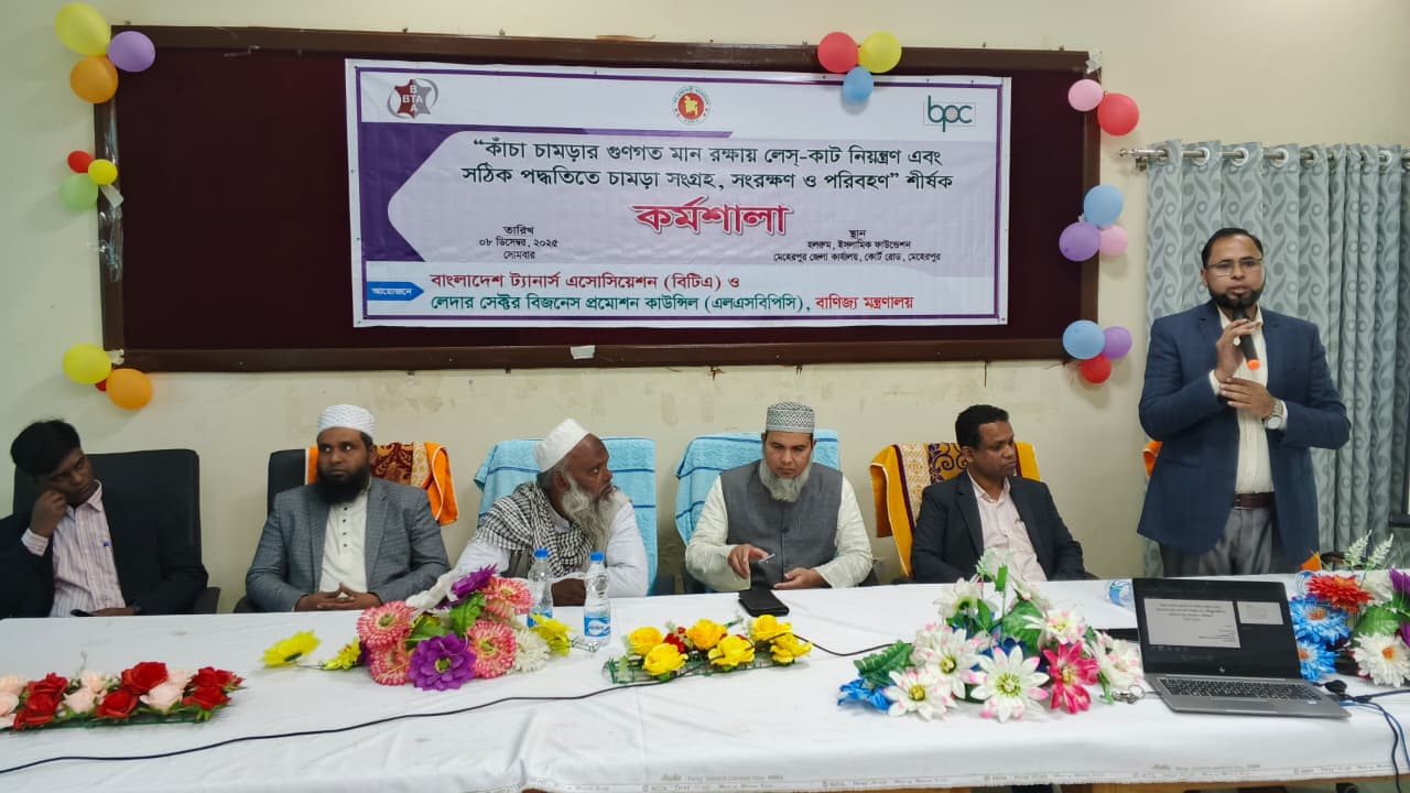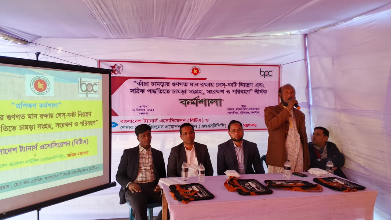 বাংলাদেশ ট্যানার্স এসোসিয়েশন (বিটিএ) এবং লেদার সেক্টর বিজনেস প্রমোশন কাউন্সিল (এলএসবিপিসি), বাণিজ্য মন্ত্রণালয় এর যৌথ উদ্যোগে “কাঁচা চামড়ার গুণগত মান রক্ষায় লেস-কাট নিয়ন্ত্রণ এবং সঠিক পদ্ধতিতে চামড়া সংগ্রহ, সংরক্ষণ ও পরিবহন” শীর্ষক এক কর্মশালা ৯ ডিসেম্বর, ২০২৫ হরিনাকুঞ্জ, ঝিনাইদহে অনুষ্ঠিত হয়। কর্মশালার বিষয়ের উপর একটি সমৃদ্ধ উপস্থাপনা করেন জনাব মোঃ সামাউল আলম, প্রভাষক, ইন্সিটিউট অব লেদার ইঞ্জিনিয়ারিং এন্ড টেকনোলজি, ঢাকা বিশ্ববিদ্যালয় এবং জনাব মিজানুর রহমান, হেড অব এডমিন, বাংলাদেশ ট্যানার্স এসোসিয়েশন (বিটিএ)।
