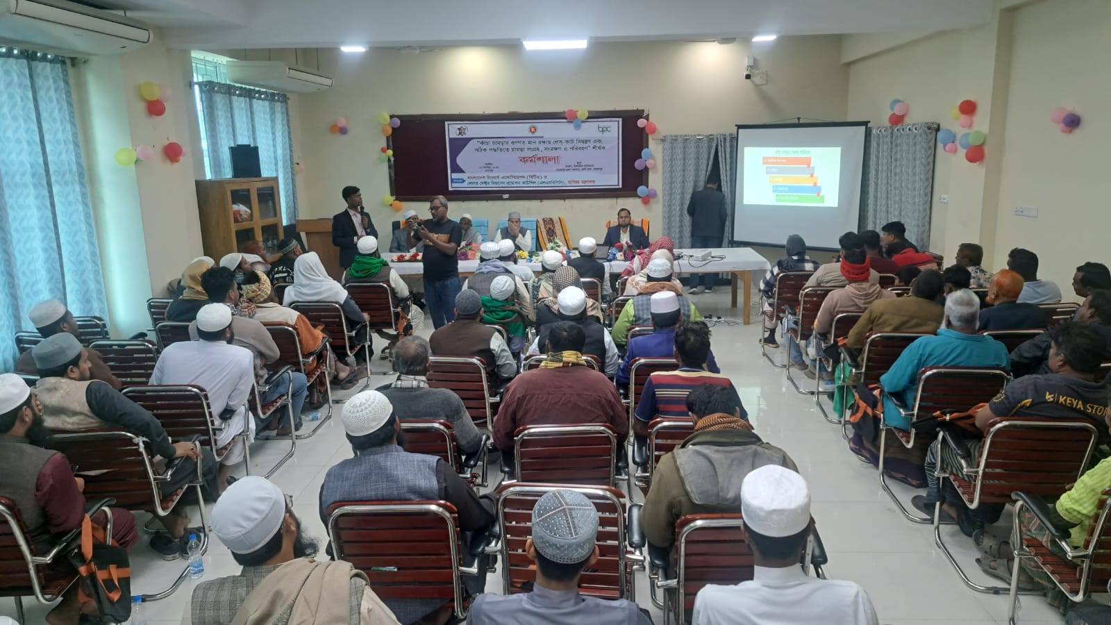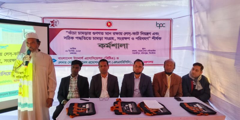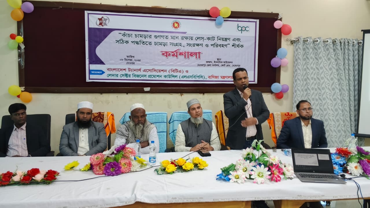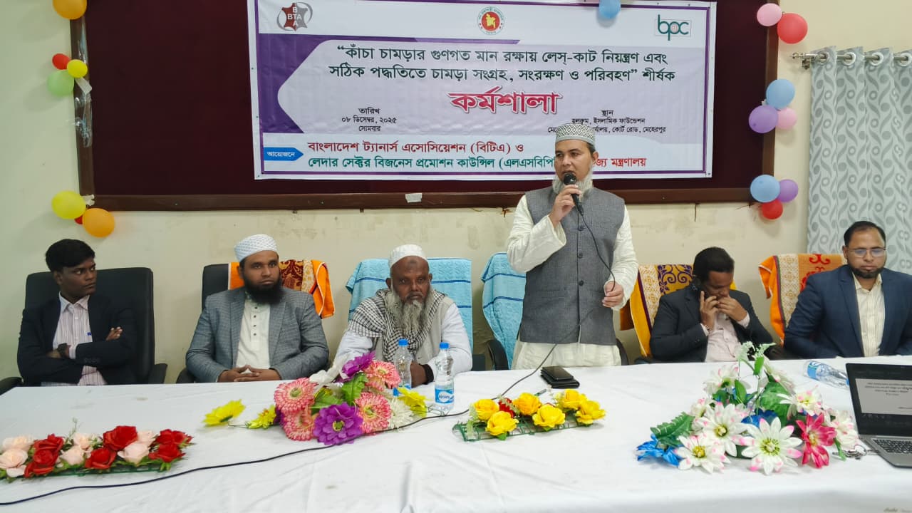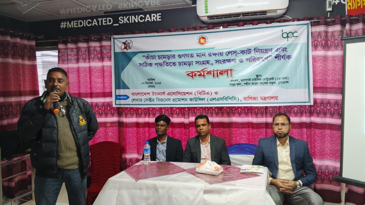 বাংলাদেশ ট্যানার্স এসোসিয়েশন (বিটিএ) এবং লেদার সেক্টর বিজনেস প্রমোশন কাউন্সিল (এলএসবিপিসি), বাণিজ্য মন্ত্রণালয় এর যৌথ উদ্যোগে “কাঁচা চামড়ার গুণগত মান রক্ষায় লেস-কাট নিয়ন্ত্রণ এবং সঠিক পদ্ধতিতে চামড়া সংগ্রহ, সংরক্ষণ ও পরিবহন” শীর্ষক এক কর্মশালা ৯ ডিসেম্বর, ২০২৫ হরিনাকুঞ্জ, ঝিনাইদহে অনুষ্ঠিত হয়। কর্মশালার বিষয়ের উপর একটি সমৃদ্ধ উপস্থাপনা করেন জনাব মোঃ সামাউল আলম, প্রভাষক, ইন্সিটিউট অব লেদার ইঞ্জিনিয়ারিং এন্ড টেকনোলজি, ঢাকা বিশ্ববিদ্যালয় এবং জনাব মিজানুর রহমান, হেড অব এডমিন, বাংলাদেশ ট্যানার্স এসোসিয়েশন (বিটিএ)।