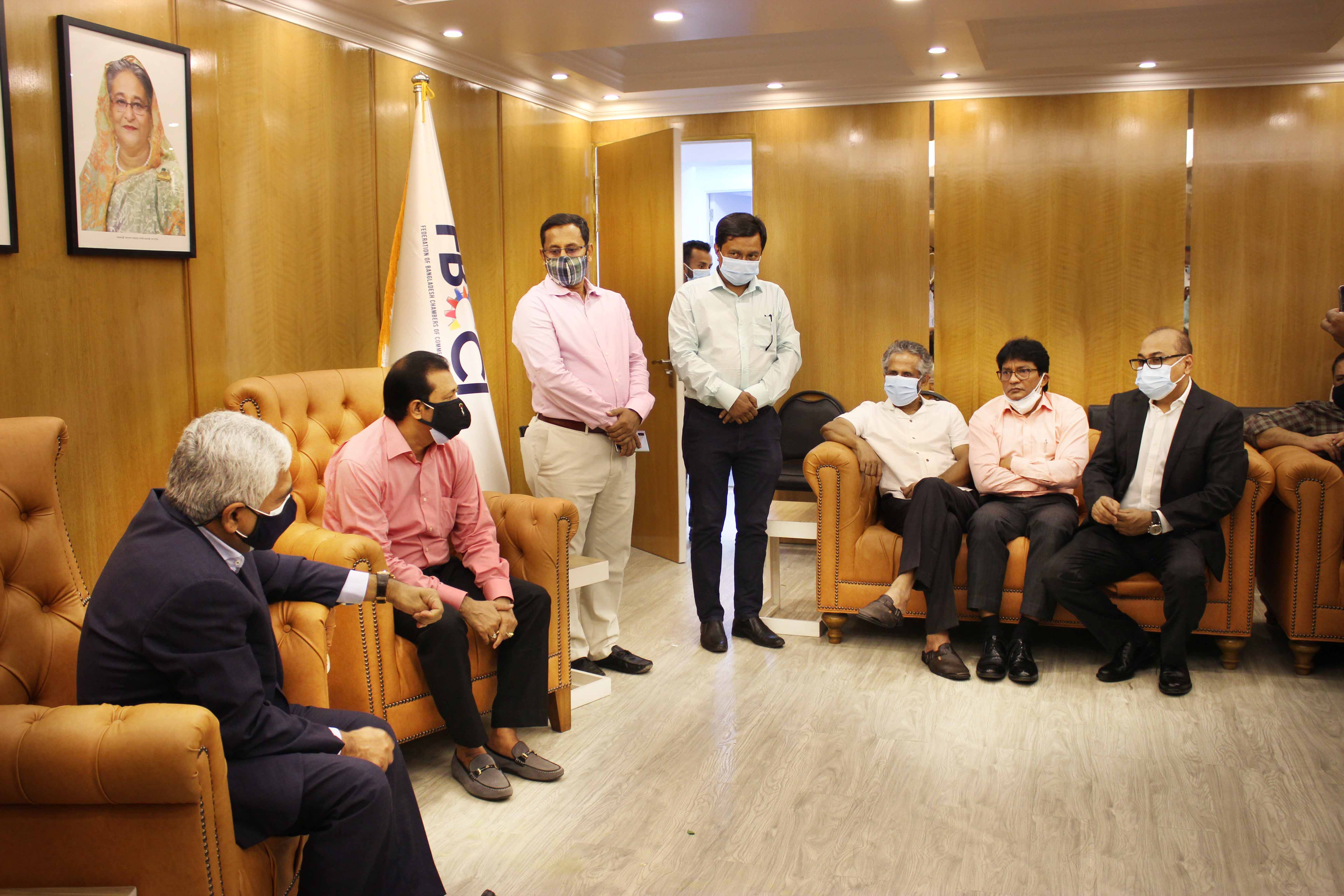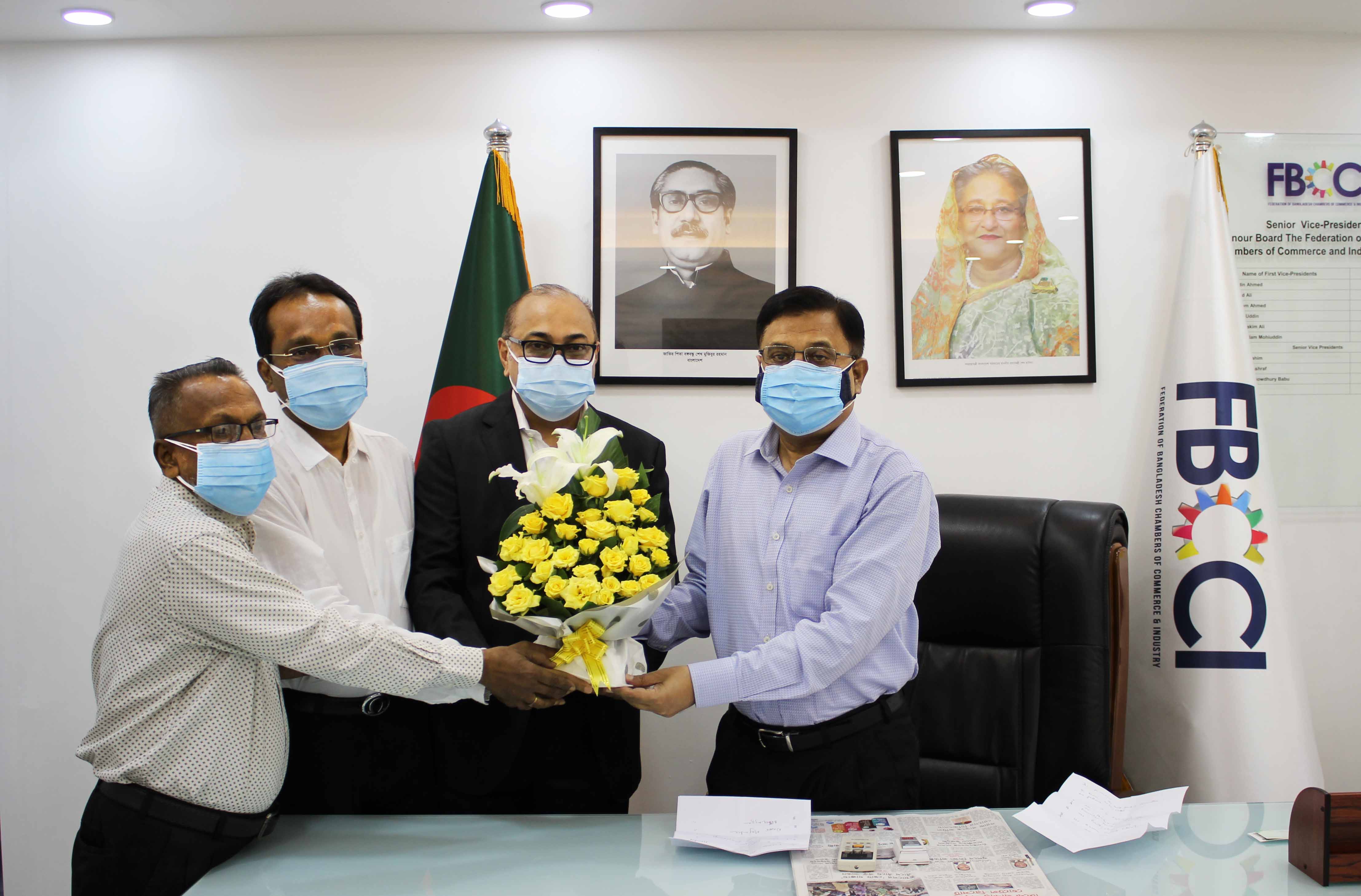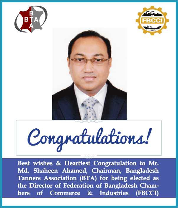 গত ২৭ মে, ২০২১ এফবিসিসিআই ভবনে বাংলাদেশ ট্যানার্স এসোসিয়েশন (বিটিএ) সহ চামড়া শিল্পের বিভিন্ন সংগঠনের পক্ষ থেকে এফবিসিসিআই-এর নবনির্বাচিত সভাপতি জনাব জসিম উদ্দিন-কে ফুলেল শুভেচ্ছা ও অভিনন্দন জানানো হয়।