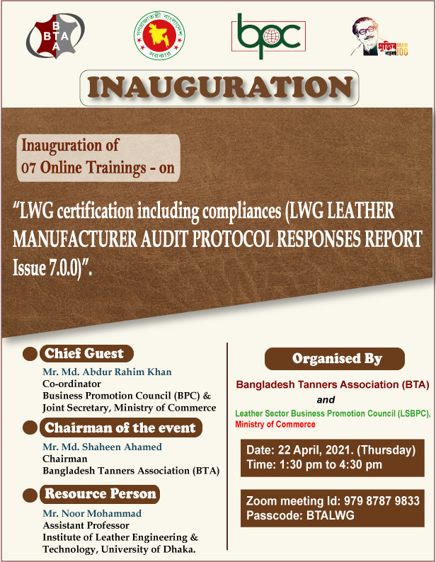 বাংলাদেশ ট্যানার্স এসোসিয়েশন (বিটিএ)’র চেয়ারম্যান জনাব শাহীন আহমেদ,জেনারেল সেক্রেটারি জনাব সাখাওয়াত ঊল্লাহ, সিনিয়র ভাইস চেয়ারম্যান জনাব ইলিয়াছুর রহমান বাবুল সহ চামড়া শিল্পের বিভিন্ন সংগঠনের নেতৃবৃন্দ উপস্থিত ছিলেন।