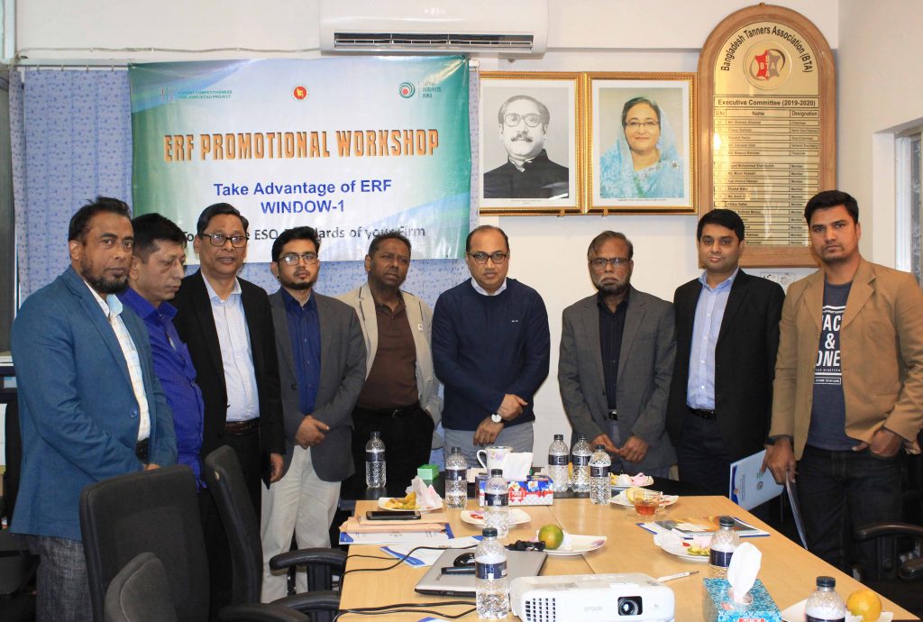 এক্সপোর্ট কমপিটিটিভনেস ফর জবস (EC4J) প্রকল্পের আওতায় উদ্যোক্তা এবং ব্যবসা প্রতিষ্ঠানের মালিক Export Readiness Fund (ERF) এর অনুদান প্রাপ্তির জন্য প্রস্তাব দাখিল করতে পারবেন। এ লক্ষ্যে Export Readiness Fund (ERF) এর ম্যাচিং গ্রান্ট প্রোগ্রাম বিষয়ে অবহিতকরণ ওয়ার্কশপ গত ০৯ ফেব্রুয়ারি, রবিবার, বিকাল ৩:০০টায় বাংলাদেশ ট্যানার্স এসোসিয়েশন (বিটিএ) এর কনফারেন্স রুমে অনুষ্ঠিত হয়।