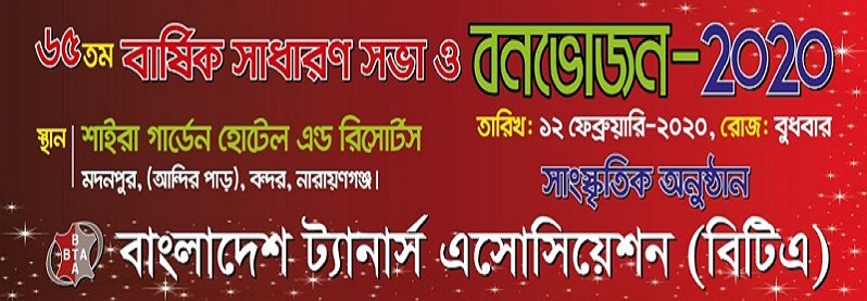 বাংলাদেশ ট্যানার্স এসোসিয়েশন (বিটিএ) এর ৬৫তম বার্ষিক সাধারণ সভা ও বনভোজন – ২০২০ গত ১২ ফেব্রুয়ারি, ২০২০ রোজঃবুধবার, শাইরা গার্ডেন হোটেল এন্ড রিসোর্টস, মদনপুর (অন্দির পাড়), নারায়ণগঞ্জে অনুষ্ঠিত হয়।