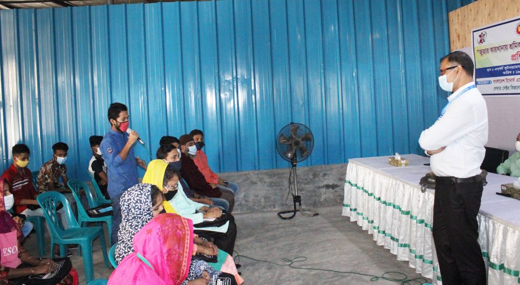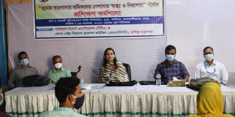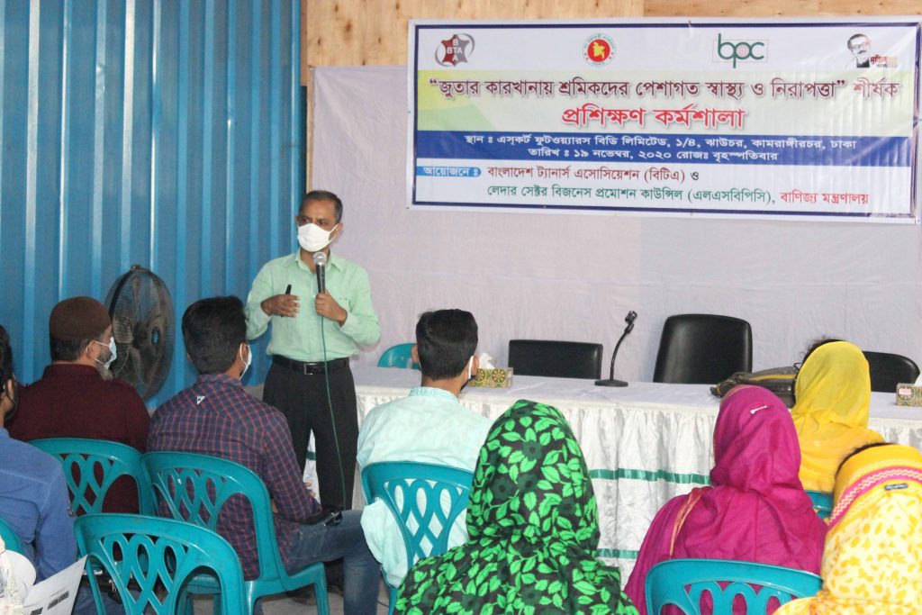 ১৯ নভেম্বর, ২০২০ রোজ বৃহস্পতিবার সকাল ৯:৩০ ঘটিকায় এসকর্ট ফুটওয়্যারস বিডি লিমিটেড, ১/৪, ঝাউচর, কামরাঙ্গিরচর, ঢাকায় “জুতার কারখানায় শ্রমিকদের পেশাগত স্বাস্থ্য ও নিরাপত্তা” শীর্ষক একটি প্রশিক্ষণ কর্মশালা অনুষ্ঠিত হয়েছে।