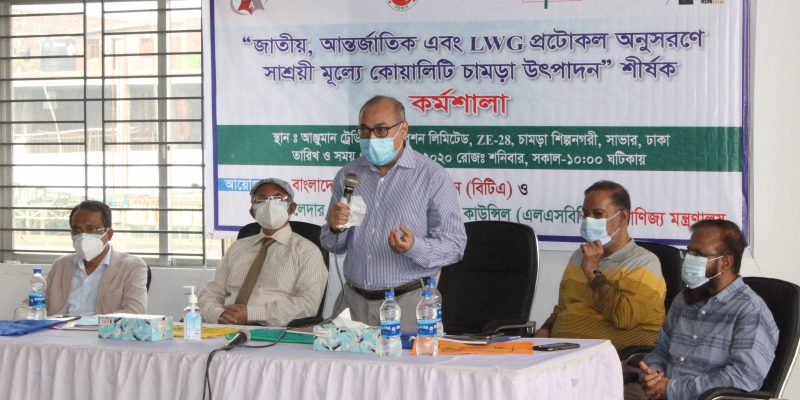 উক্ত প্রতিবেদন এবং অডিট সহায়িকা বিতরণ এবং এর বিষয়বস্তুর উপর আলোচনার লক্ষ্যে গত ৫ ডিসেম্বর, ২০২০, রোজ-শনিবার, সকাল ১০:৩০ ঘটিকায় আঞ্জুমান ট্রেডিং কর্পোরেশন লিঃ, প্লট নং- ZE-২৮, চামড়া শিল্পনগরী, ঢাকা-য় “জাতীয়, আন্তর্জাতিক এবং LWG প্রটোকল অনুসরণে সাশ্রয়ী মূল্যে কোয়ালিটি চামড়া উৎপাদন” শীর্ষক একটি কর্মশালা অনুষ্ঠিত হয়েছে। কর্মশালার বিষয়বস্তুর উপর সমৃদ্ধ উপস্থাপনা করেন জনাব নূর মুহাম্মদ, সহকারী অধ্যাপক, ইনস্টিটিউট অব লেদার ইঞ্জিনিয়ারিং এন্ড টেকনোলজি, ঢাকা বিশ্ববিদ্যালয়।