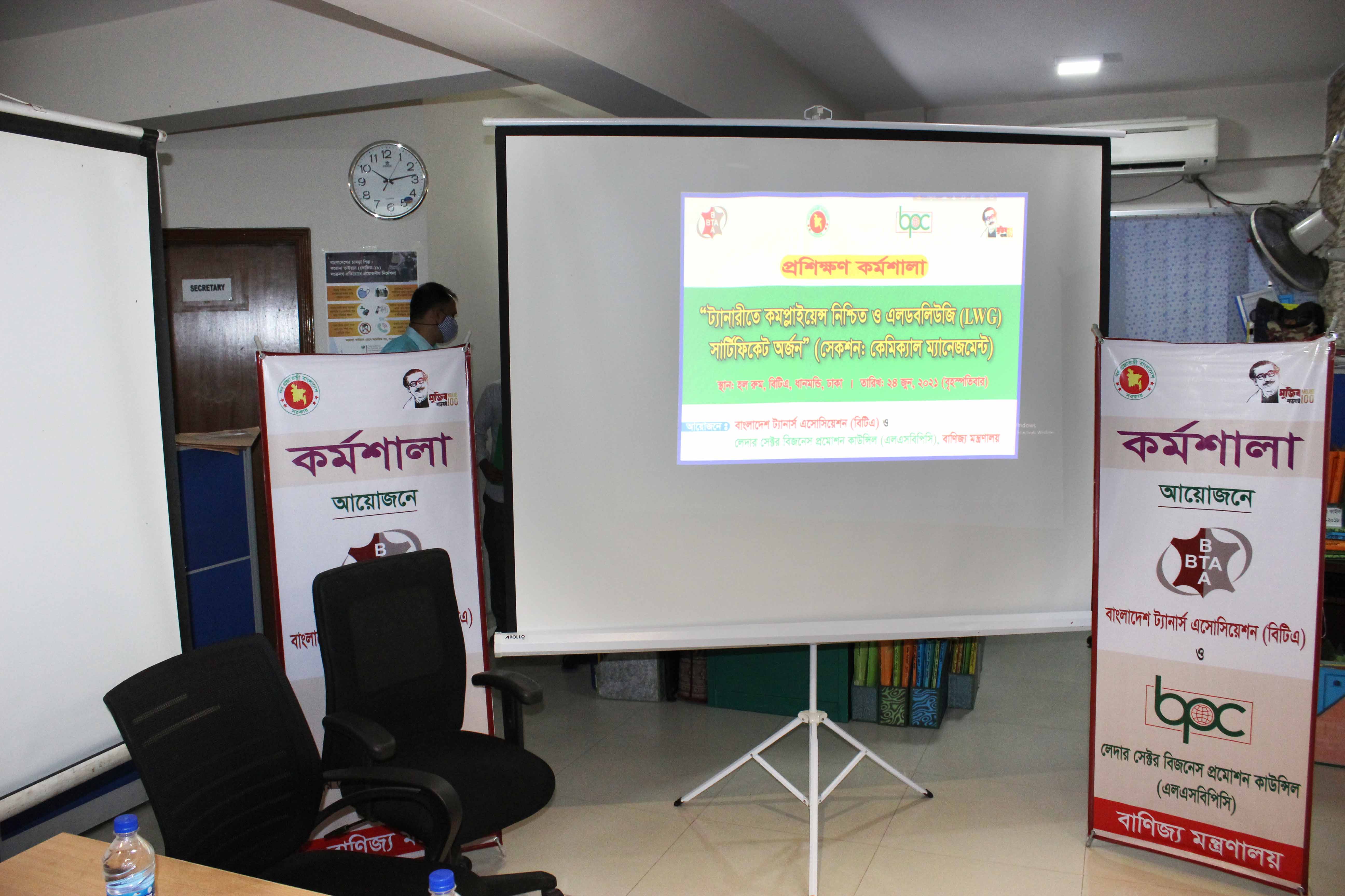 বাংলাদেশ ট্যানার্স এসোসিয়েশন (বিটিএ) এবং লেদার সেক্টর বিজনেস প্রমোশন কাউন্সিল (এলএসবিপিসি), বাণিজ্য মন্ত্রণালয় এর যৌথ উদ্যোগে গত ৩১ মার্চ ২০২১ তারিখ থেকে শুরু হওয়া “ট্যানারিতে কমপ্লাইয়েন্স নিশ্চিত ও এলডবলিউজি (LWG) সার্টিফিকেট অর্জন” বিষয়ের উপর সিরিজ কর্মশালার ৭ম এবং সমাপনী কর্মশালা, ২৪ জুন, ২০২১ বাংলাদেশ ট্যানার্স এসোসিয়েশন (বিটিএ)’র হল রুমে অনুষ্ঠিত হয়।