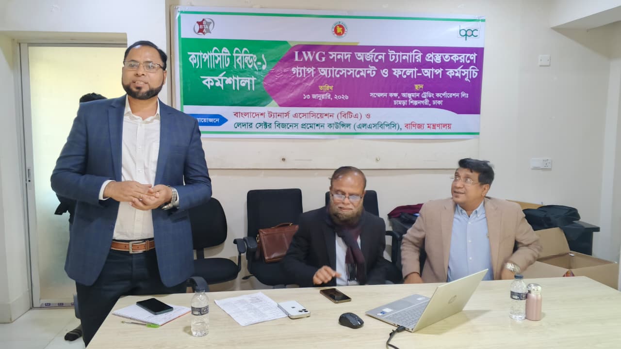 বাংলাদেশ ট্যানার্স এসোসিয়েশন (বিটিএ) এবং লেদার সেক্টর বিজনেস প্রমোশন কাউন্সিল (এলএসবিপিসি), বাণিজ্য মন্ত্রণালয় এর যৌথ উদ্যোগে LWG সনদ অর্জনে ট্যানারী প্রস্তুত করণে গ্যাপ অ্যাসেসমেন্ট ও ফলো-আপ কর্মসূচির আওতায়, ২০ টি ট্যানারি থেকে মনোনীত প্রতিনিধিদের সমন্বয়ে Capacity Building-0১ শীর্ষক কর্মশালা গত ১৩ জানুয়ারি, ২০২৬ চামড়া শিল্প নগরীতে অবস্থিত আঞ্জুমান ট্রেডিং কর্পোরেশন লিঃ এর হলরুমে অনুষ্ঠিত হয়।