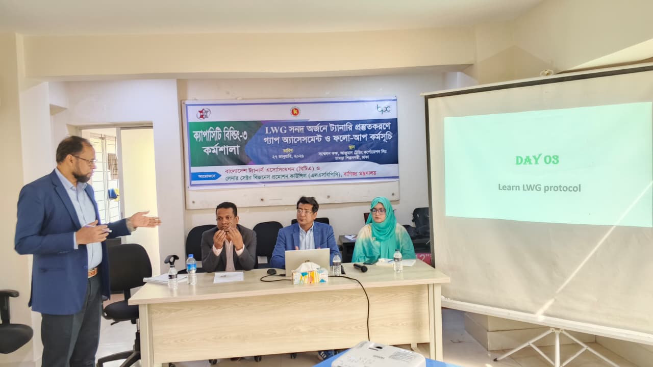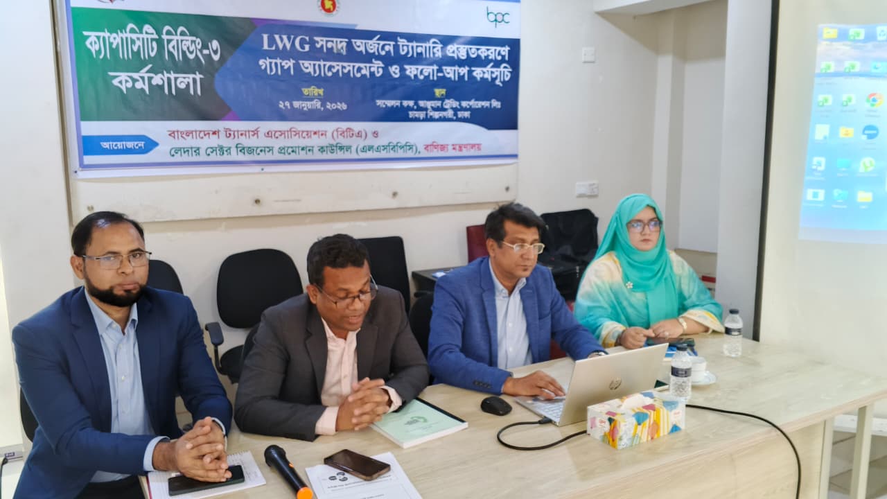 বাংলাদেশ ট্যানার্স এসোসিয়েশন (বিটিএ) এবং লেদার সেক্টর বিজনেস প্রমোশন কাউন্সিল (এলএসবিপিসি), বাণিজ্য মন্ত্রণালয় এর যৌথ উদ্যোগে LWG সনদ অর্জনে ট্যানারী প্রস্তুত করণে গ্যাপ অ্যাসেসমেন্ট ও ফলো-আপ কর্মসূচির আওতায়, ২০ টি ট্যানারি থেকে মনোনীত প্রতিনিধিদের সমন্বয়ে Capacity Building-03 শীর্ষক কর্মশালা গত ২৭ জানুয়ারি, ২০২৬ চামড়া শিল্প নগরীতে অবস্থিত আঞ্জুমান ট্রেডিং কর্পোরেশন লিঃ এর হলরুমে অনুষ্ঠিত হয়।