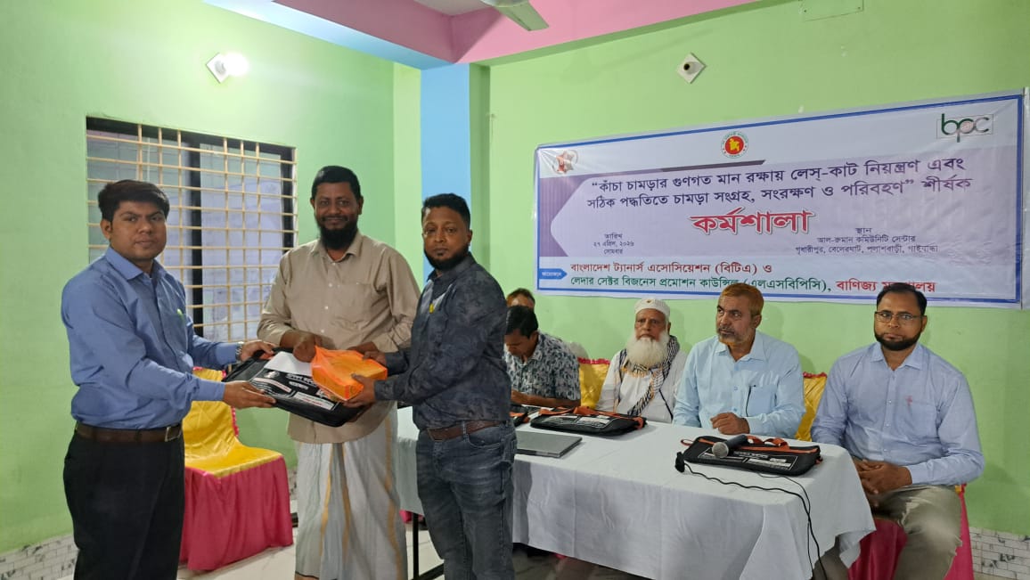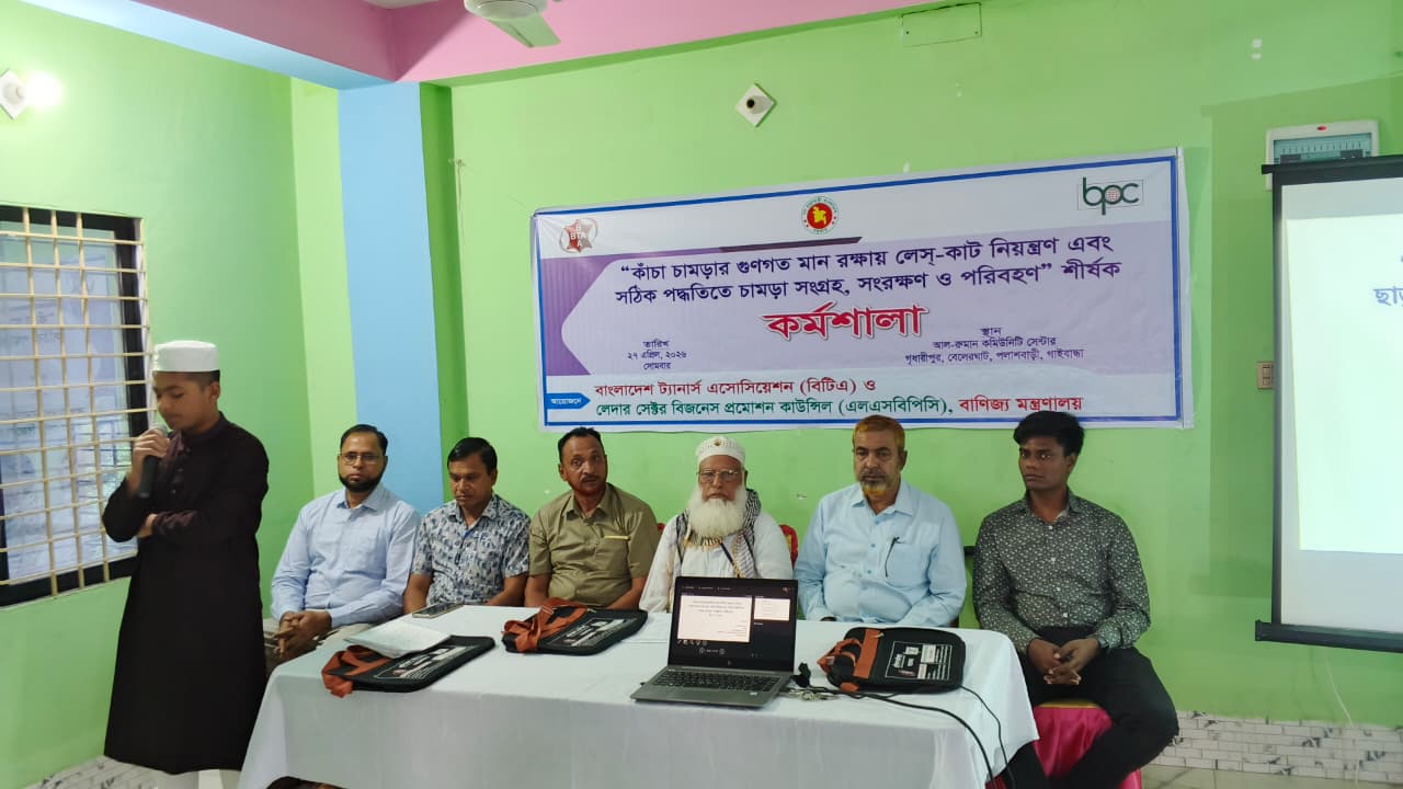 বিটিএ ও এলএসবিপিসি, বাণিজ্য মন্ত্রাণালয় এর যৌথ উদ্যোগে ২৭ এপ্রিল, ২০২৬ তারিখে পলাশবাড়ী, গাইবান্ধায় “কাঁচা চামড়ার গুণগত মান রক্ষায় লেস্-কাট নিয়ন্ত্রণ এবং সঠিক পদ্ধতিতে চামড়া সংগ্রহ, সংরক্ষণ ও পরিবহণ” শীর্ষক কর্মশালা অনুষ্ঠিত হয়। কর্মশালায় উপস্থাপনা করেন জনাব মোঃ সামাউল আলম, প্রভাষক, ইনস্টিটিউট অব লেদার ইঞ্জিনিয়ারি এন্ড টেকনোলজি, ঢাকা বিশ্ববিদ্যালয় ও মিজানুর রহমান, হেড অব এডমিন, বিটিএ। কর্মশালায় উস্থিত ছিলেন, জনাব মোঃ আফতাব মোল্লা, সভাপতি, জনাব মো: সাইফুল ইসলাম নান্নু, সহ-সভাপতি, জনাব আবুল কালাম আজাদ মিনু, সাধারণ সম্পাদক ও জনাব মোঃ মোস্তাক আহমেদ, সাংগঠনিক সম্পাদক, পলাশবাড়ী উপজেলা চামড়া ব্যবসায়ী সমবায় সমিতি। আরো উপস্থিত ছিলেন, স্থানীয় কাঁচা চামড়া ও মাংস ব্যবসায়ী, স্কুল, মাদ্রাসা ও মসজিদের ইমামসহ সংশ্লিষ্ট ব্যক্তিবর্গ উপস্থিত ছিলেন। বিটিএ-র কর্মকর্তা-কর্মচারীবৃন্দ উপস্থিত ছিলেন